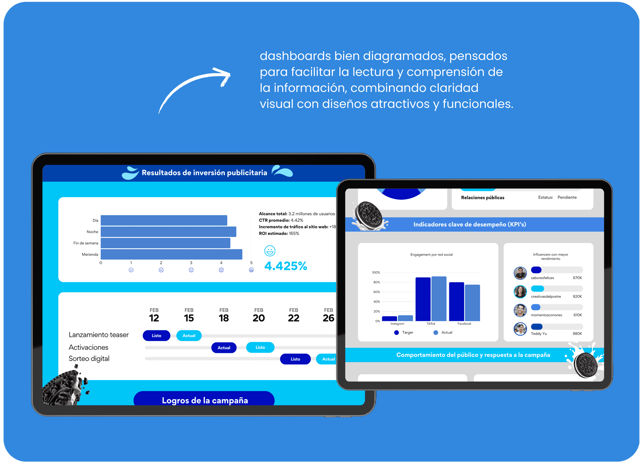 Mi labor en este proyecto consistió en transformar dashboards empresariales en herramientas visuales atractivas que se adaptan con precisión a la identidad de cada campaña. Más allá de organizar datos, mi enfoque fue aplicar lineamientos gráficos y colorimetría para asegurar una coherencia total con el branding de la marca. Para romper con la rigidez habitual de estos paneles y hacer la navegación más orgánica, integré banners animados en el header y footer. Estos elementos dinámicos no solo captan la atención de inmediato, sino que funcionan como espacios estratégicos para presentar información útil sobre el grupo de trabajo y el propósito del reporte. El resultado es un dashboard que deja de ser un informe estático para convertirse en una experiencia visual fluida y profesional.